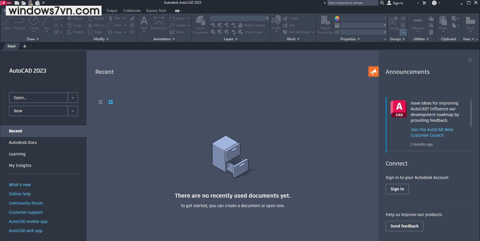 Bước 7: Mở phần mềm, bạn sẽ thấy giao diện chính của AutoCAD 2023.
