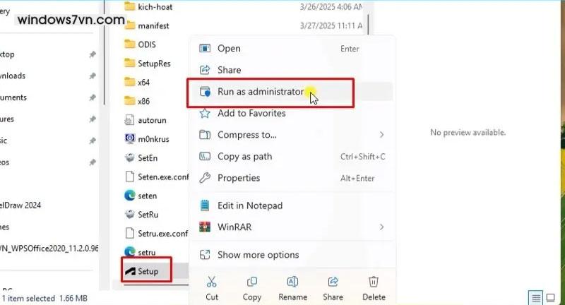 Bước 2: Chuột phải vào file Setup.exe và chọn Run as administrator để chạy bằng quyền quản trị viên.