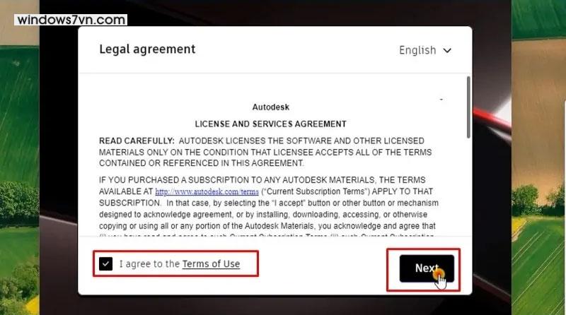 Bước 4: Tích chọn mục đồng ý điều khoản sử dụng như hiển thị => Nhấn Next.
