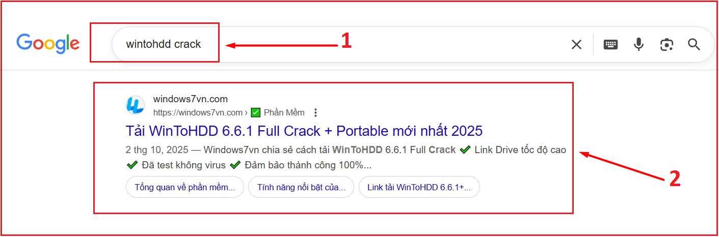 Bước 1: Tìm từ khóa wintohdd crack và click vào website “Widows7vn.com”.