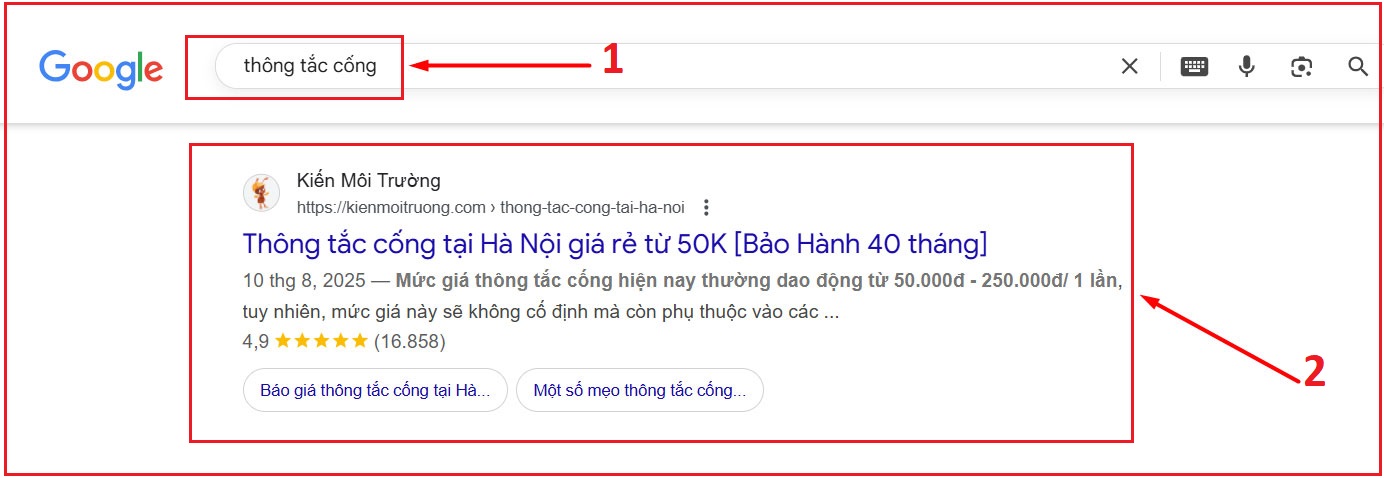 Bước 1: Tìm từ khóa thông tắc cống và click vào website “Kienmoitruong.com”.