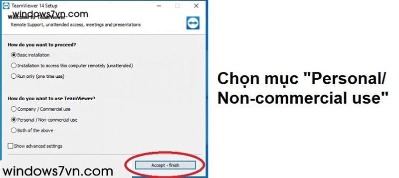 Bước 3: Trên màn hình cài đặt “Welcome to TeamViewer“, chọn “Default Installation” và “Both of the above“, sau đó nhấn “Accept – Finish“.