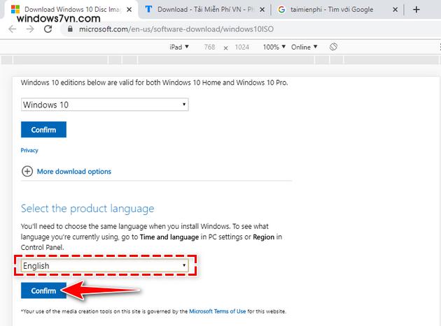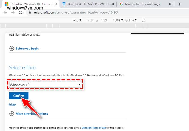 Bước 5: Bấm F5 để tải lại trang. Quay lại màn hình giao diện của trang web, bạn sẽ thấy xuất hiện mục “Select Edition.” Bây giờ, bấm vào đó và chọn “Windows 10,” sau đó nhấn “Confirm.”