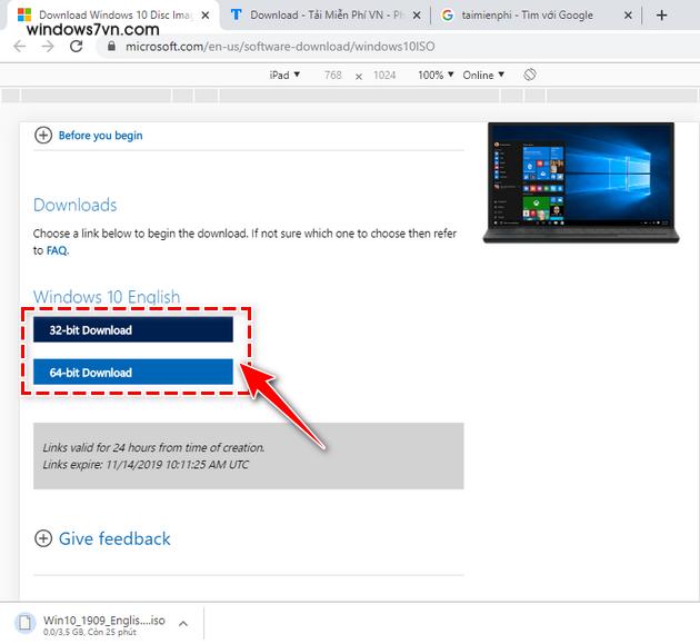 Bước 7: Cuối cùng, bạn chọn phiên bản 32-bit hoặc 64-bit tùy theo cấu hình của máy tính. Sau khi chọn, quá trình tải Windows 10 19H2 sẽ bắt đầu. Hãy kiên nhẫn chờ đợi.